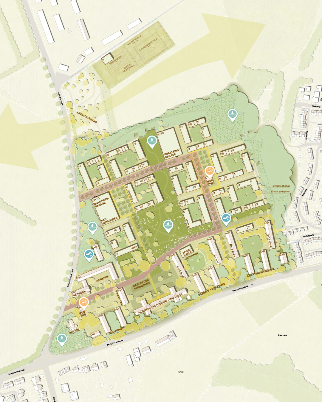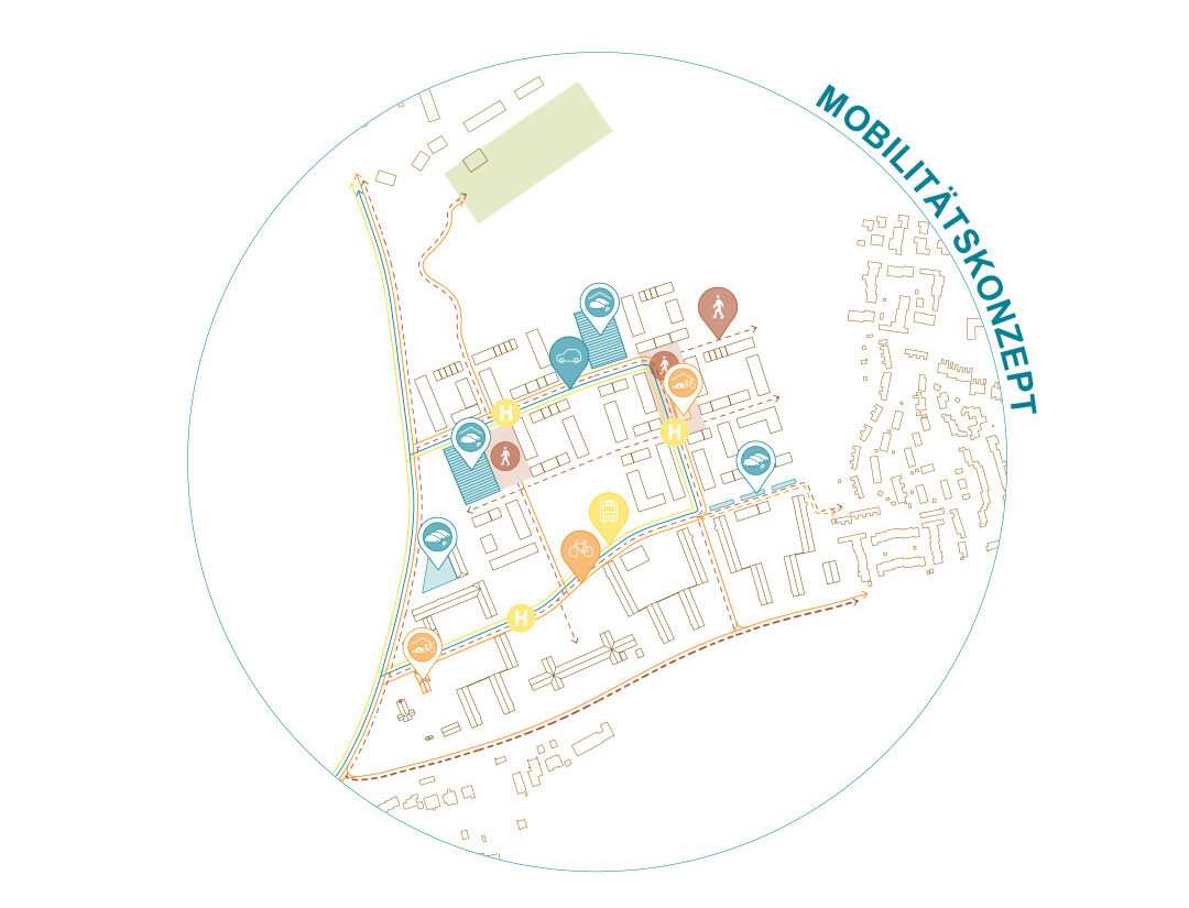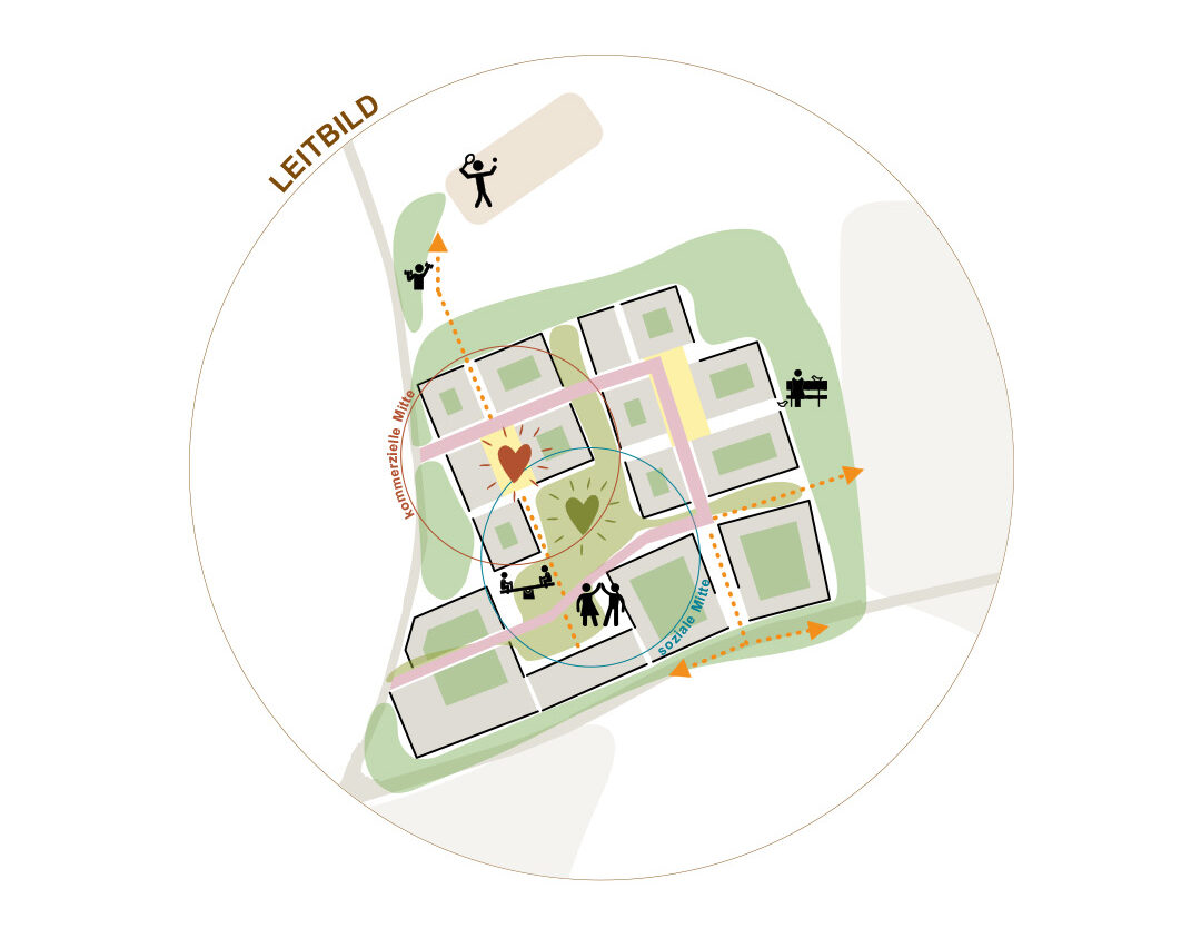 Das Zentrum des neuen Quartiers bildet ein grünes Herz – eine offene Mitte, die von zwei funktionalen Polen gerahmt wird: einer kommerziellen Mitte mit Nahversorger und weiteren gewerblichen Nutzungen sowie einer sozialen Mitte mit Kita, Grundschule und Angeboten der Altenpflege sowie Vereinsräumen. Dieser Bereich fungiert als zentraler Begegnungsraum und fördert das Miteinander der Generationen. Auch die Innenhöfe der neuen Gebäude sind durchgrünt und bieten geschützte Aufenthaltsbereiche für die Bewohnerinnen und Bewohner. Es entsteht ein lebendiges, durchgrüntes Quartier, in dem das Leben unter einem Blätterdach stattfindet – offen, vielfältig und gemeinschaftlich.